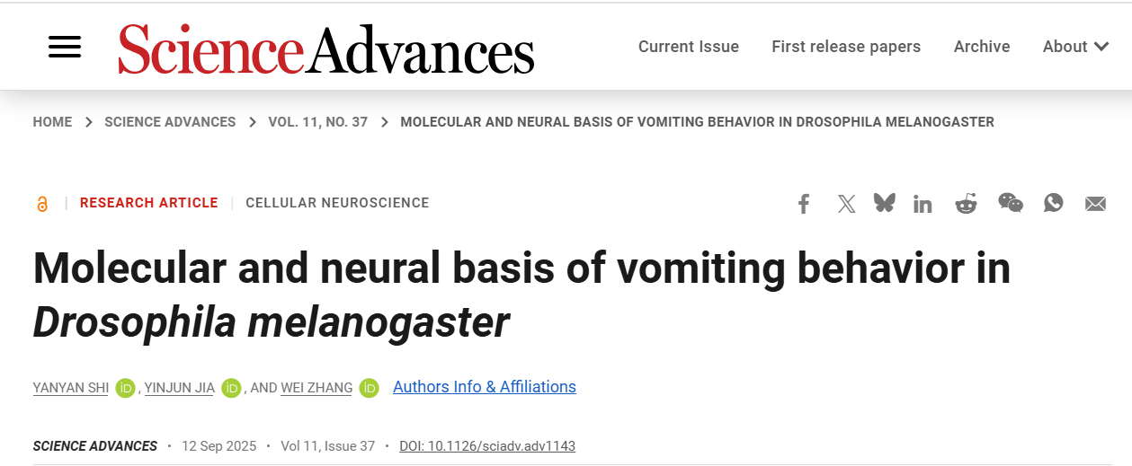 2025年9月12日,清华大学生命学院、清华-IDG/麦戈文脑科学研究院张伟课题组在 Science Advances 期刊上在线发表题为Molecular and neural basis of vomiting behavior in Drosophila melanogaster 的研究论文。该研究首次发现黑腹果蝇具备呕吐能力,并通过遗传学与药理学手段,系统解析出一条完整的“从输入到输出”的呕吐调控环路。这一成果不仅填补了遗传动物模型的空白,也为人类呕吐相关疾病的研究与治疗提供了新的思路。