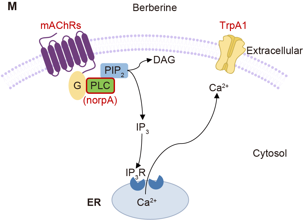 为阐明黄连素诱导呕吐的分子机制,研究团队聚焦于TrpA1,一种在哺乳动物和果蝇中均高度保守的化学感受器。TrpA1突变后,果蝇呕吐行为显著减少,表明TrpA1在呕吐中起重要作用。然而,现有研究显示黄连素无法直接激活TrpA1,提示其作用可能通过间接通路实现。进一步实验发现,敲除磷脂酶C(PLC)核心基因norpA的果蝇无法呕吐,支持了TrpA1可能通过GPCR和PLC通路被激活的假设。研究人员随后测试了多种GPCR激动剂,发现仅乙酰胆碱(ACh)和胆碱能显著诱导呕吐。由于黄连素可抑制胆碱酯酶,团队使用两种胆碱酯酶抑制剂进行验证,均观察到类似效果。此外,针对毒蕈碱型乙酰胆碱受体(mAChRs)的激动剂比烟碱型受体激动剂更有效,提示mAChRs在这一过程中起主导作用。双重突变实验进一步证实,TrpA1和mAChRs(特别是mAChR-B和mAChR-C)协同工作,而非平行通路。基于此,研究提出了黄连素通过mAChRs-PLC通路间接激活TrpA1的模型。