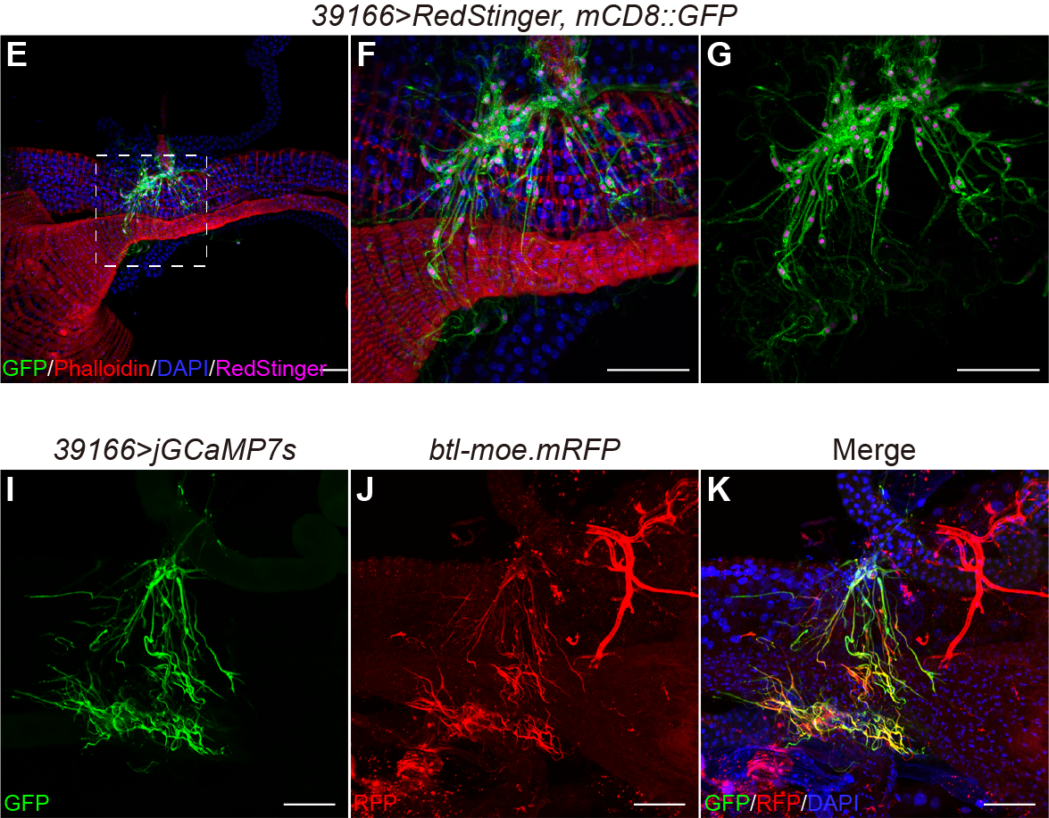 图2:39166-GAL4标记的气管细胞(btl标记)缠绕嗉囊导管末端和中肠前段。