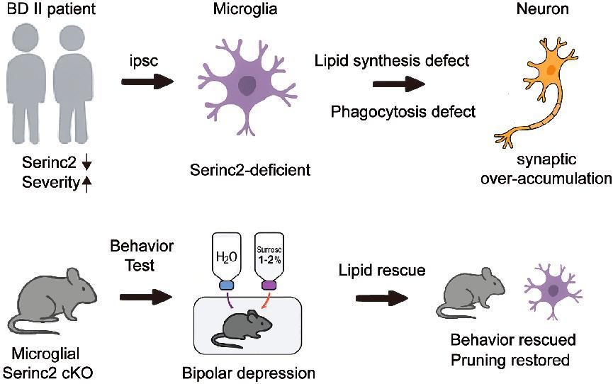 在这项研究中,作者首次揭示了小胶质细胞中Serinc2基因缺陷与BDII的抑郁症状发生之间的分子机制。研究团队通过全基因组测序与病例-对照分析发现,Serinc2罕见突变与BD易感相关,并且在BDII患者血浆中其表达水平显著降低,与疾病严重程度呈负相关。