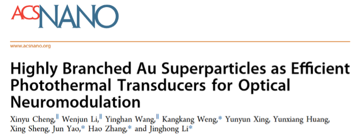 清华大学化学系李景虹、张昊、生命学院姚骏、化学系瓮康康共同通讯团队聚焦于通过结构设计提升光热转换材料性能,成功设计出一种新型高效光热转换材料——高度分支的Au超粒子(3D Au superparticles),并利用其实现精准的神经活动控制。相关研究成果于近日以“Highly Branched Au Superparticles as Efficient Photothermal Transducers for Optical Neuromodulation”为题在线发表于国际知名期刊ACS Nano。