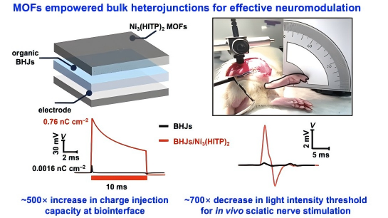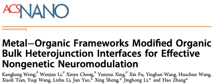 针对这一难题,清华大学化学系李景虹、张昊、电子工程系盛兴、生命学院姚骏共同通讯团队创新性地设计引入了由导电和多孔金属有机框架(MOF)组成的界面层。这一突破性设计有效应对了诸多挑战,为神经调控领域带来新曙光。相关研究成果于近日以“Metal–Organic Frameworks Modified Organic Bulk Heterojunction Interfaces for Effective Nongenetic Neuromodulation”为题在线发表于ACS Nano期刊。