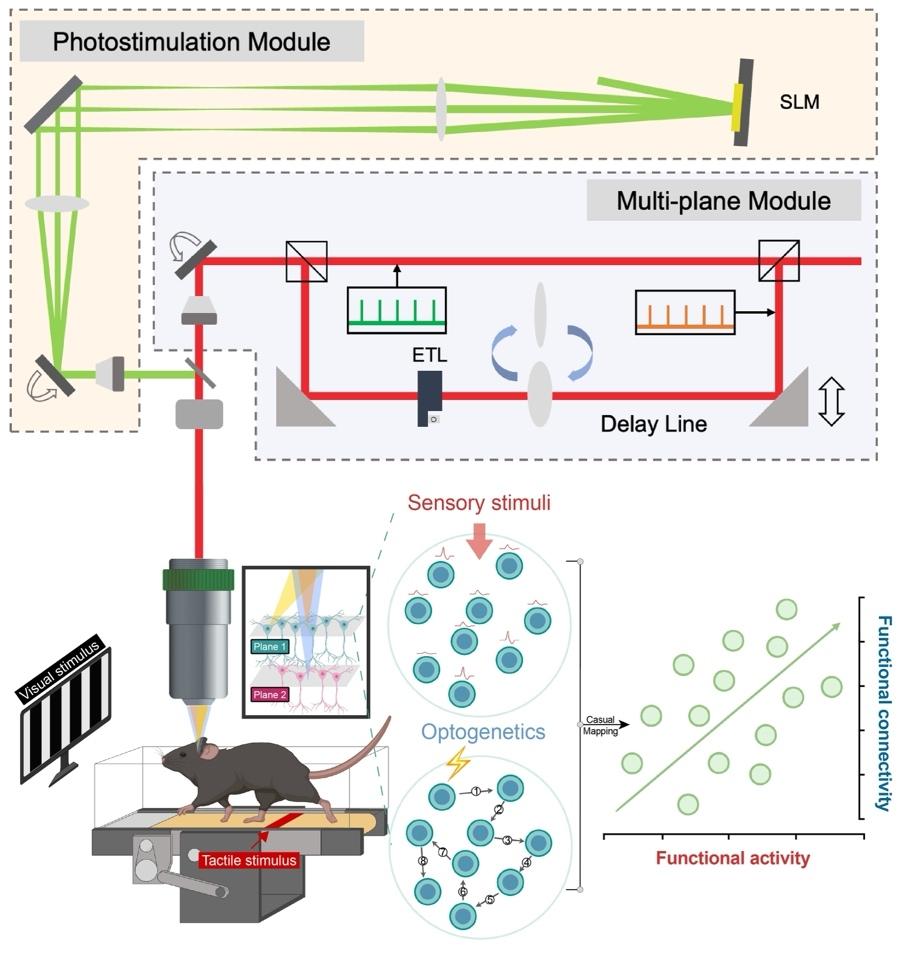 近日,清华-IDG/麦戈文脑科学研究院孔令杰、钟毅课题组、北京人工智能研究院雷博课题组合作在Cell Reports上在线发表了题为“Linking functional activity and connectivity of neuronal circuits via fast cross-layer all-optical physiology”的研究论文 。该研究设计搭建了一种全新的跨层全光生理系统(CLAOP)。CLAOP通过深度融合时空复用成像技术与全息光遗传学操控技术,克服了传统硬件惯性限制的速度瓶颈,实现了毫秒级、单细胞精度的跨层“读写”闭环。以CLAOP作为高通量解析工具,研究者在活体小鼠视觉与体感皮层中揭示了跨层神经元“功能相似即连接”(Like-to-like)的因果组构规律,为解析大脑三维神经网络的功能架构提供了强有力的技术支持。