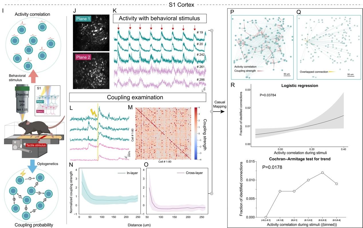 利用CLAOP系统卓越的时空分辨率与读写能力,研究团队在小鼠的初级视觉皮层(V1)、体感皮层(S1)及海马区(Hippocampus)开展了在体研究,从多个维度验证了跨层神经回路的功能架构。