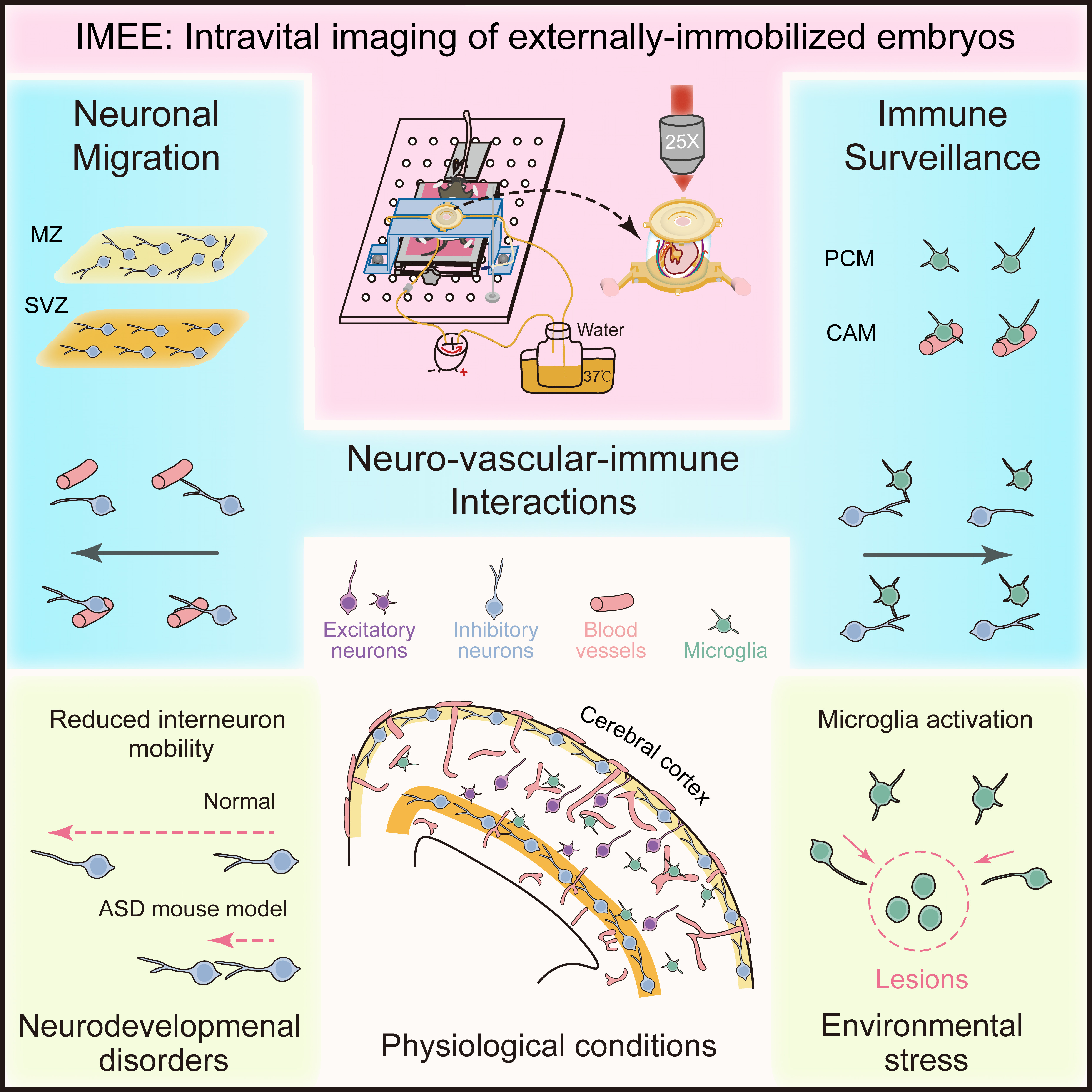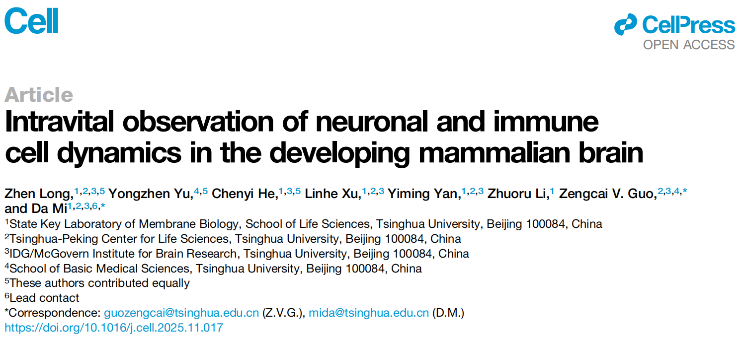 2025年12月16日,清华大学生命科学学院、清华-IDG/麦戈文脑科学研究院、生命科学联合中心、膜生物学全国重点实验室米达团队,与清华大学基础医学院、清华-IDG/麦戈文脑科学研究院、生命科学联合中心郭增才团队合作,在Cell发表了题为Intravital observation of neuronal and immune cell dynamics in the developing mammalian brain的研究论文。该研究开发了一种高稳定性、多视角、长时程的胚胎小鼠宫内活体成像技术(IMEE),首次在体阐明了胚胎小鼠大脑皮层内抑制性神经元与血管网络及小胶质细胞间的动态互作模式。研究还为神经发育性疾病模型小鼠中神经元迁移异常提供了全新在体证据,同时解析了胚胎免疫细胞在响应环境压力时的动态行为模式。这项工作突破了传统胚胎神经成像的技术瓶颈,为解析大脑发育过程中的神经-血管-免疫系统互作机制与协同发育机制开辟了全新的研究范式,凸显了胚胎活体成像技术在神经科学与脑疾病研究中的重要价值。