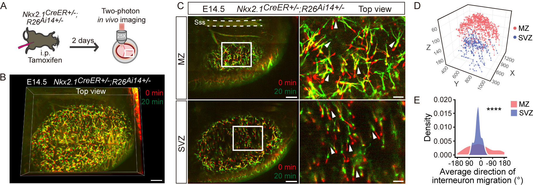 利用不同品系的转基因小鼠内源荧光标记或小鼠胚胎电转技术,研究人员标记了胚胎小鼠大脑皮层内的兴奋性或抑制性神经元,并结合IMEE成像,系统性地鉴定了不同类型神经元的个体与群体迁移模式。结果显示,源于背侧端脑的新生兴奋性神经元通过多极化迁移(Multipolar migration)、位移运动(Locomotion)及胞体转运(Somal translocation)方式在大脑皮层中进行径向迁移;而产生于腹侧端脑的抑制性神经元则分别通过异质或同质方向扩散模式于皮层边缘区(Marginal zone,MZ)或脑室下区(Subventricular zone,SVZ)进行切向迁移。
