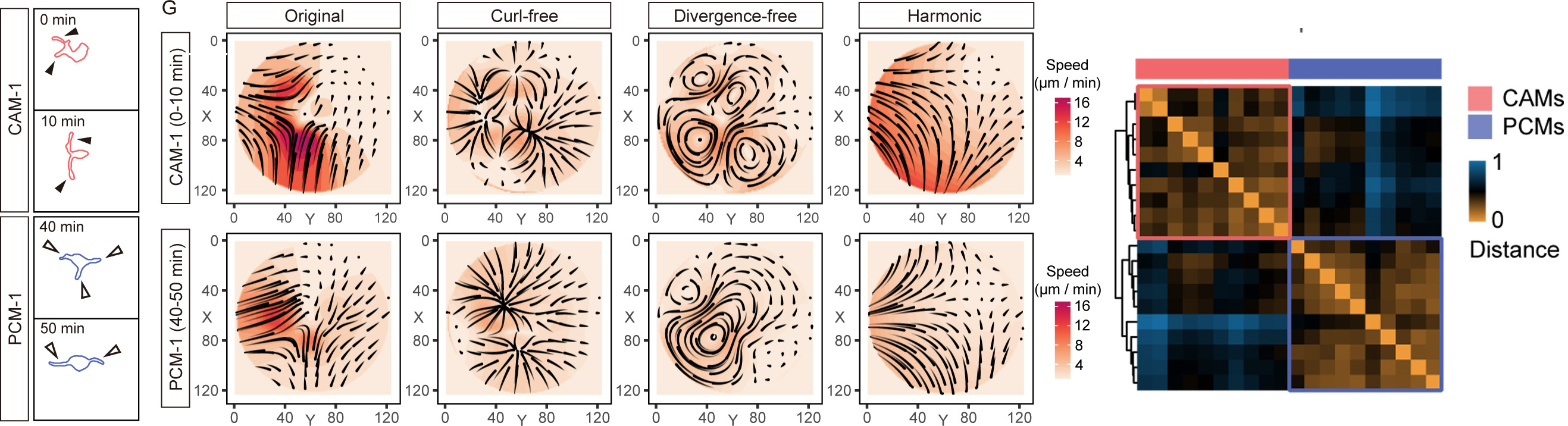 此外,借助IMEE技术,研究人员对Cx3cr1GFP+/-转基因胚胎小鼠大脑皮层中内源荧光标记的小胶质细胞进行了实时观测,并结合细胞形态变化构建向量场,进行了拓扑分解分析。结果显示,静息状态下的毛细血管相关小胶质细胞(Capillary-associated microglia, CAMs)与脑实质小胶质细胞(Parenchymal microglia, PCMs)在环境监视中表现出不同的动态行为模式,其中后者显示出更活跃的细胞突起伸缩运动。