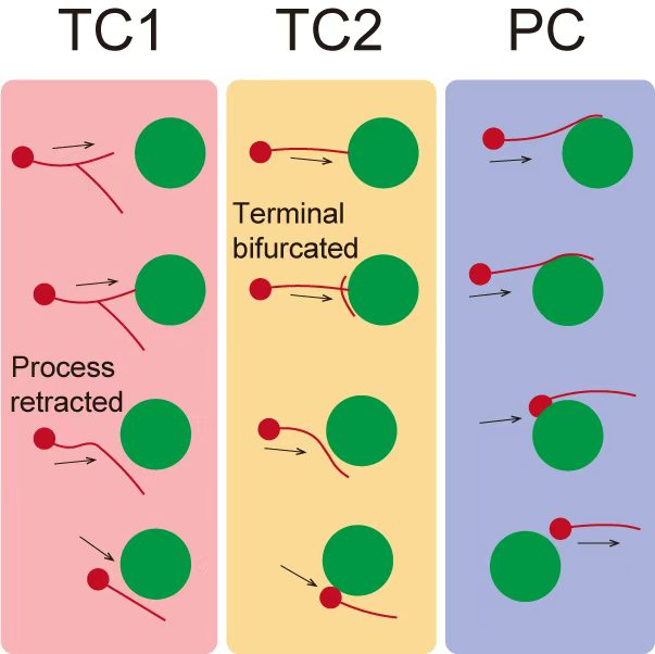 结合活体血管标记技术与IMEE,研究首次实现了对哺乳动物胚胎大脑内神经血管免疫互作的实时观测。根据抑制性神经元在切向迁移过程中其引导突与血管的接触方式,研究人员区分出两类互作模式:末端接触(Terminal contact,TC)与突起接触(Process contact,PC)。结果表明,末端接触会引发神经元引导突分支收缩或新生,从而改变迁移路径以绕过接触对象;而突起接触则允许神经元沿原方向继续迁移,例如沿血管壁“滑动”。