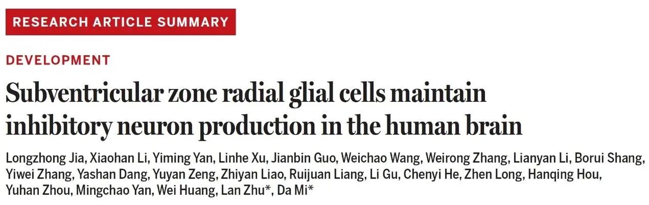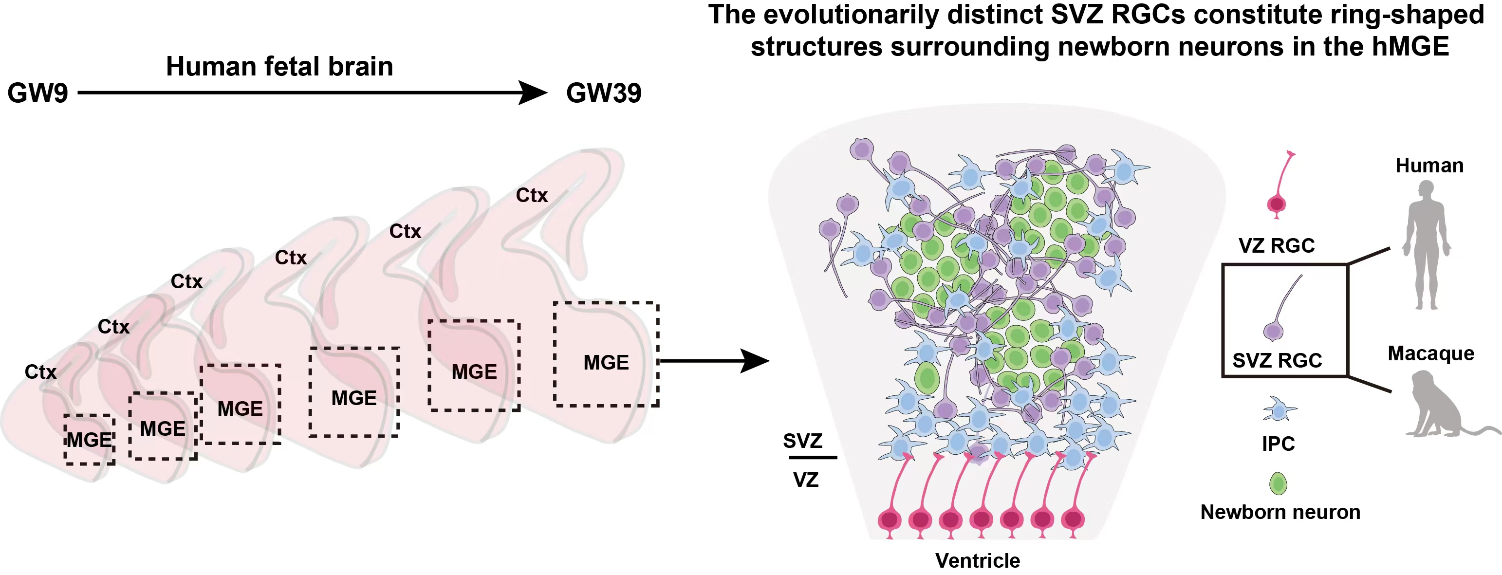 2026年1月15日,清华大学生命学院、清华-IDG/麦戈文脑科学研究院米达团队联合中国医学科学院北京协和医院朱兰院士团队在《科学》(Science) 发表了一项突破性研究“脑室下区放射状胶质细胞维持人脑抑制性神经元的持续产生” (Subventricular zone radial glial cells maintain inhibitory neuron production in the human brain)。该研究聚焦人脑动态发育过程,基于珍贵样本系统绘制了人类大脑内侧神经节隆起(MGE)脑区的细胞发育图谱,首次在人类胎儿大脑中发现了一类独特的神经干细胞类型—— SVZ RGC (脑室下区放射状胶质细胞),并揭示SVZ RGC在人类妊娠期中持续产生抑制性神经元和神经胶质细胞,从而增加了人类大脑皮层抑制性神经元的数量及比例。这项研究为深入理解人类特有的大脑抑制性神经元发育机制和在进化上大脑皮层扩张机制提供了重要理论基础。鉴于抑制性神经元的功能缺陷与癫痫、自闭症等多种神经系统疾病密切相关,这类新型神经干细胞的发现将为未来相关疾病的潜在干预策略开辟新的方向。