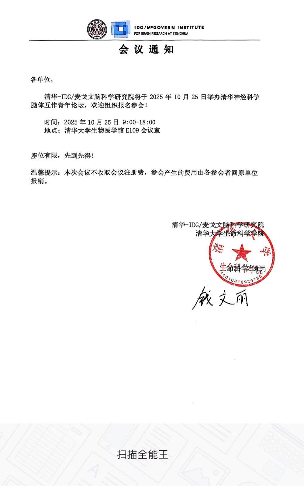 会议名称:清华神经科学脑体互作青年论坛 主办单位:清华-IDG/麦戈文脑科学研究院 会议时间:2025年10月25日 会议地点:清华大学生物医学馆E109会议室